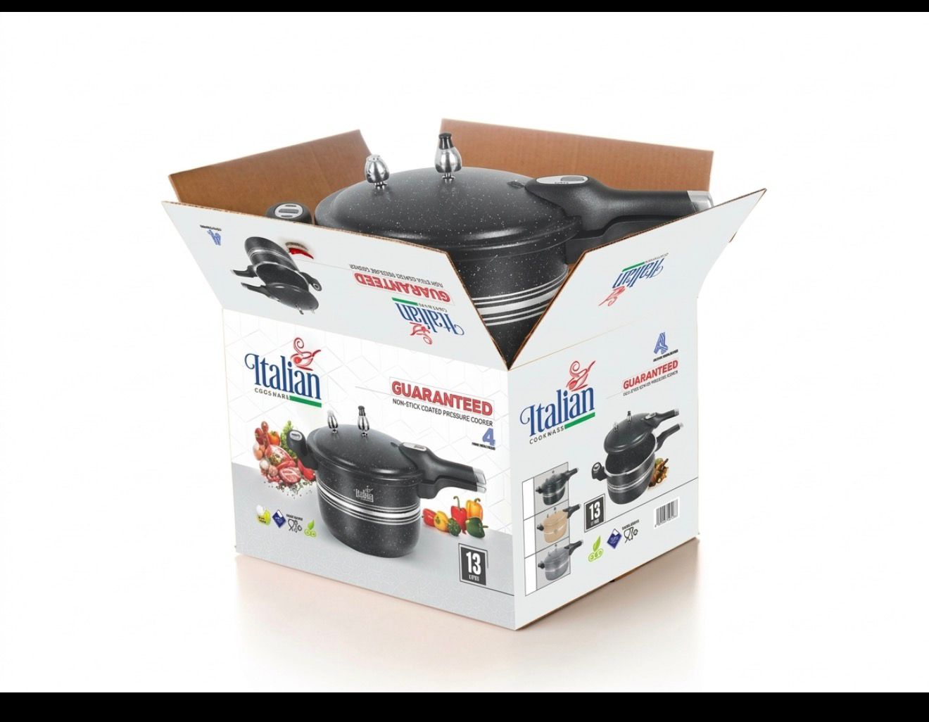 The King Bazar AR Dessini Non-Stick Pressure Cooker is a top-tier kitchen essential designed for those who value both efficiency and style. With its advanced non-stick coating, this pressure cooker ensures that food releases easily and cleaning is a breeze. It is available in three sophisticated colors—maroon, skin, and black—so you can choose one that complements your kitchen decor perfectly.